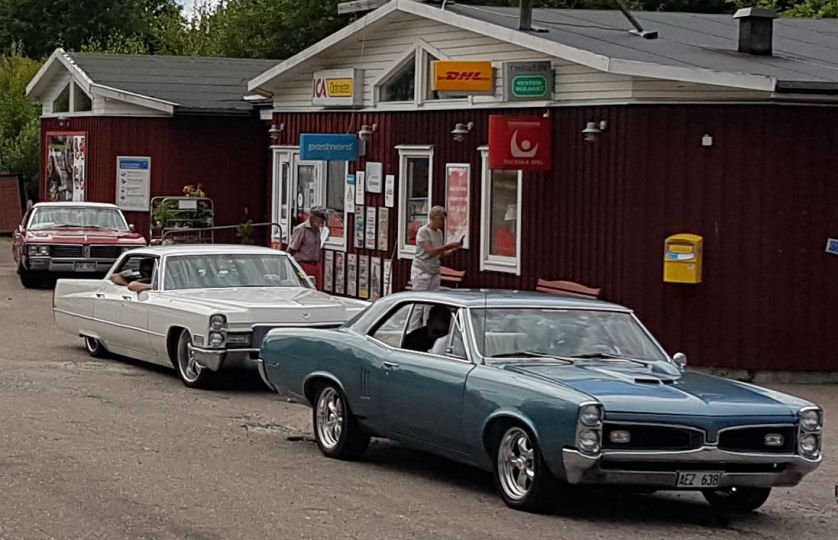 Bilden är tagen i samband med att veteranbilar på väg till veteranbilsträff i Årjäng tog paus i Gustavsfors.